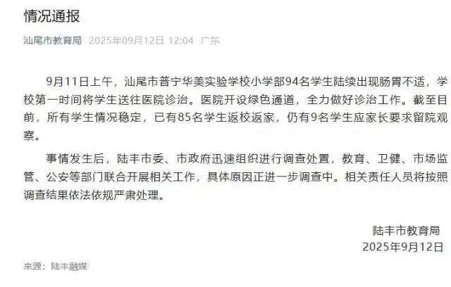 通报称,事情发生后,陆丰市委、市政府迅速组织进行调查处置,教育、卫健、市场监管、公安等部门联合开展相关工作,具体原因正进一步调查中。相关责任人员将按照调查结果依法依规严肃处理。