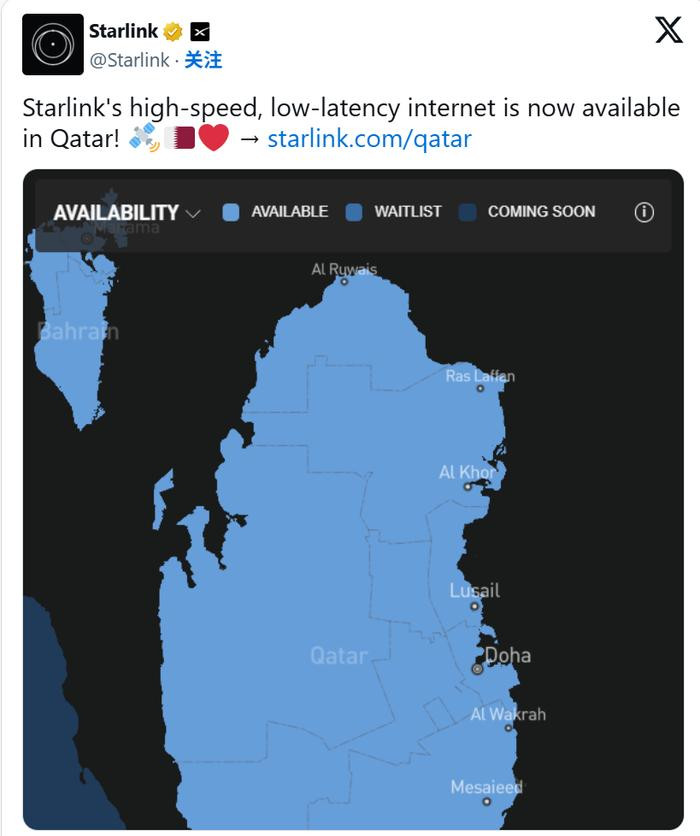 总部位于美国的星链目前服务于140个国家和地区及其他市场的600多万用户,并持续扩大其全球覆盖范围和服务能力。该公司今年迄今已宣布在35个新增市场推出服务,最近一次是在卡塔尔。